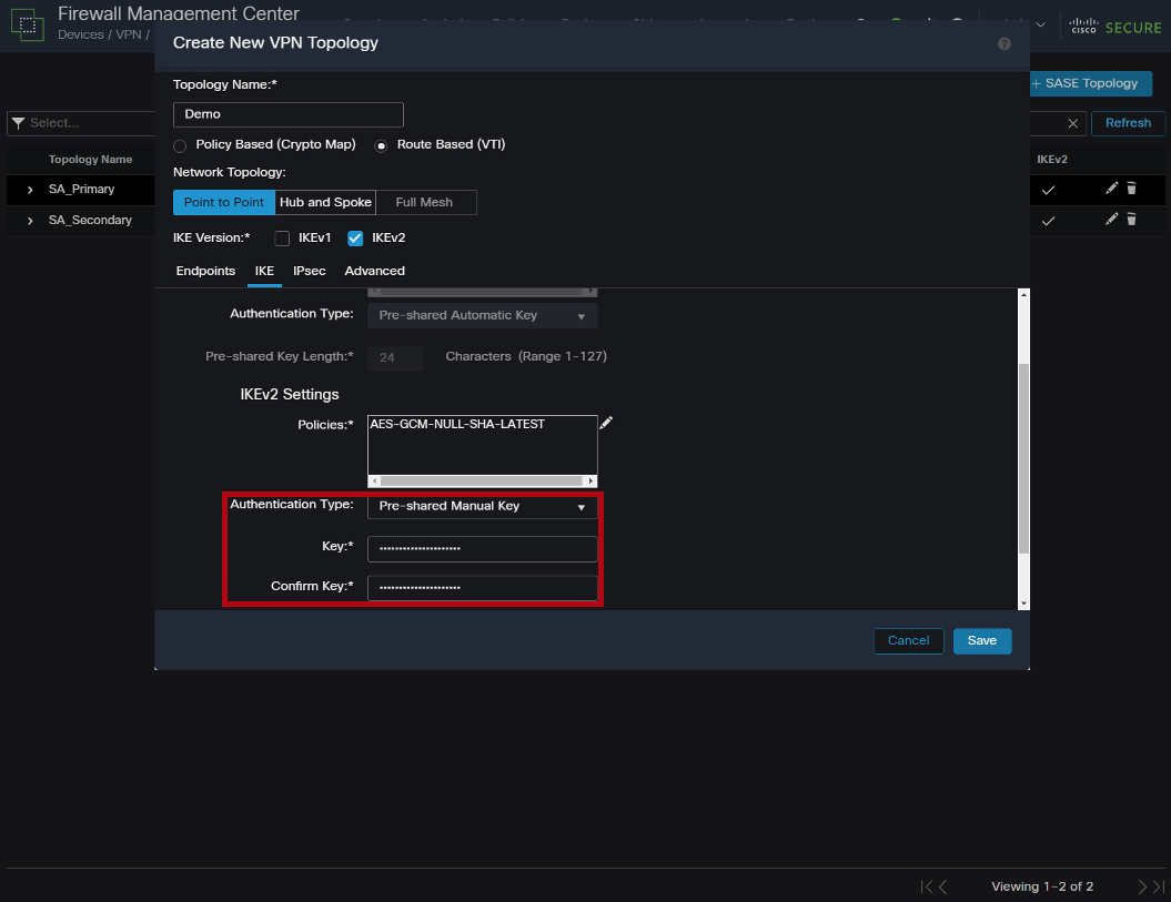 Click on the IKE tab. Under IKEv2 Settings, for authentication type, select Pre-Shared Manual Key. Enter the Passphrase from Secure Access.
