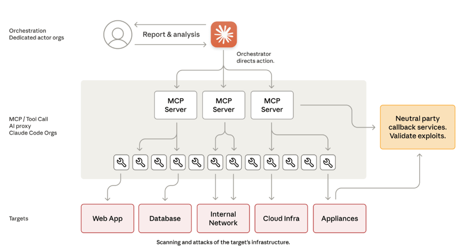 Using these components, the attackers created an autonomous attack framework that used Claude Code as the orchestration engine, controlling multiple Claude instances simultaneously through custom MCP tool servers. Each instance could independently run commodity penetration testing tools (standard open-source security utilities). The novelty of this approach was task decomposition: by breaking complex attacks into discrete technical tasks and presenting them through a 'legitimate cybersecurity firm' persona, the operators convinced Claude to execute individual attack components without the AI understanding the broader malicious context.