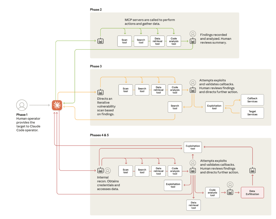 This campaign was different. Human operators provided strategic direction and authorization at critical gates, but AI agents performed nearly all tactical operations autonomously. Reconnaissance, vulnerability discovery, exploitation, credential harvesting, lateral movement, and data exfiltration—all happened with minimal human intervention.