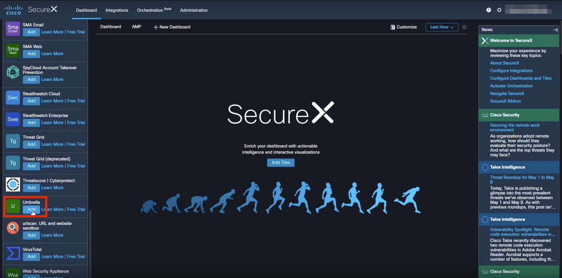 Begin by opening SecureX. On the Dashboard, in the left panel, scroll down to Umbrella and click Add.